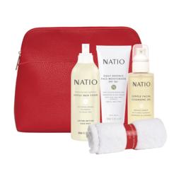 A beautiful Natio Aromatherapy gift set. Contains a full size Rosewater and Chamomile Gentle Skin Toner Face Mist, Daily Defence Face Moisturiser SPF 50+, Gentle Facial Cleansing Oil and a Natio luxe cotton face washer. Presented in a complimentary Natio cosmetic bag.